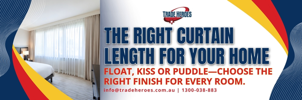 Use one simple rule to choose the perfect length. Float by 10–15 mm in high traffic rooms, kiss for most living and sleeping spaces, break by 20–25 mm for relaxed linen, and puddle by 75–150 mm only in formal settings. Measure carefully from hardware to floor, double check, and steam your curtains so the drop reads level. When you are ready to upgrade, compare local curtain specialists on Trade Heroes and find the right installer for your window treatments. For a polished finish, many homeowners choose to have curtains professionally measured and installed. You can find curtain and blind installers through Trade Heroes in Perth, Sydney, Adelaide, Melbourne, Hobart or Brisbane.